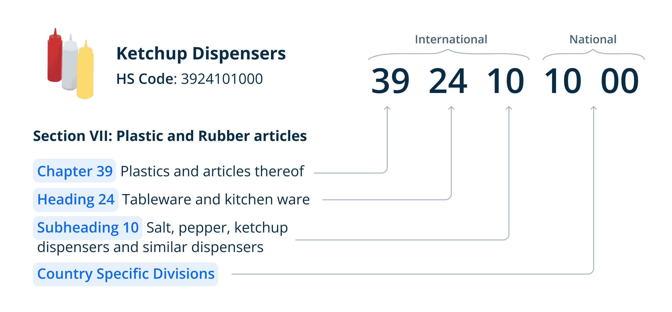 HS codes, consisting of 6 digits, are structured into Chapters (initial 2 digits), Headings (first 4 digits), and Subheadings (complete 6 digits). This classification system extends its granularity through subdivisions into 7- to 12-digit items, varying by country and alternatively known as commodity codes or national tariff lines.